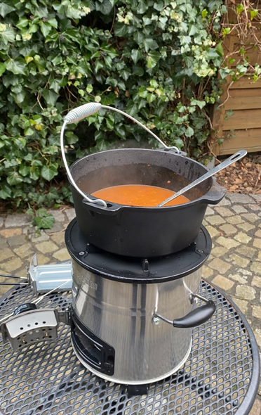 Wir haben den BBQ-Torro Raketenofen mit USB Lüfter *getestet und mit nur wenigen Holzstücken eine Gulaschsuppe in nur 5 Minuten erhitzt – schnell, effizient und energiesparend.